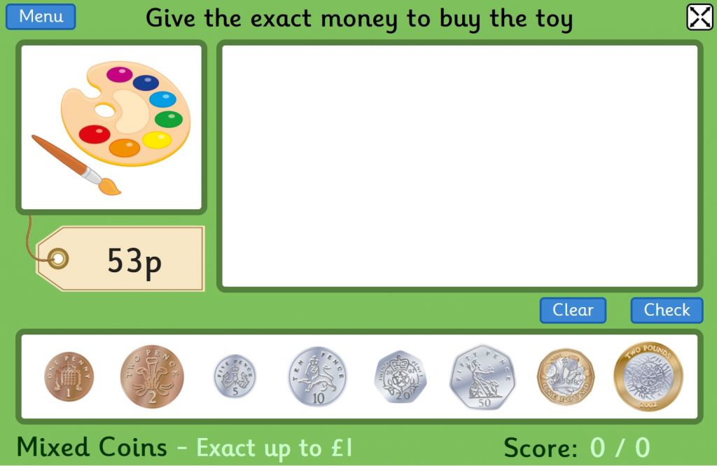 Play this game for 10 minutes as a recap of yesterday’s learning. Click on ‘Mixed coins,’ ‘Exact Money’ and then ‘Up to Β£1.’