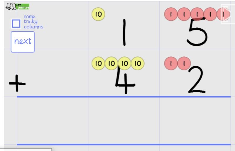 If you feel you need to practise adding lower numbers, rather than tackling the column addition, click on the robot game. There is a number line included to help you.