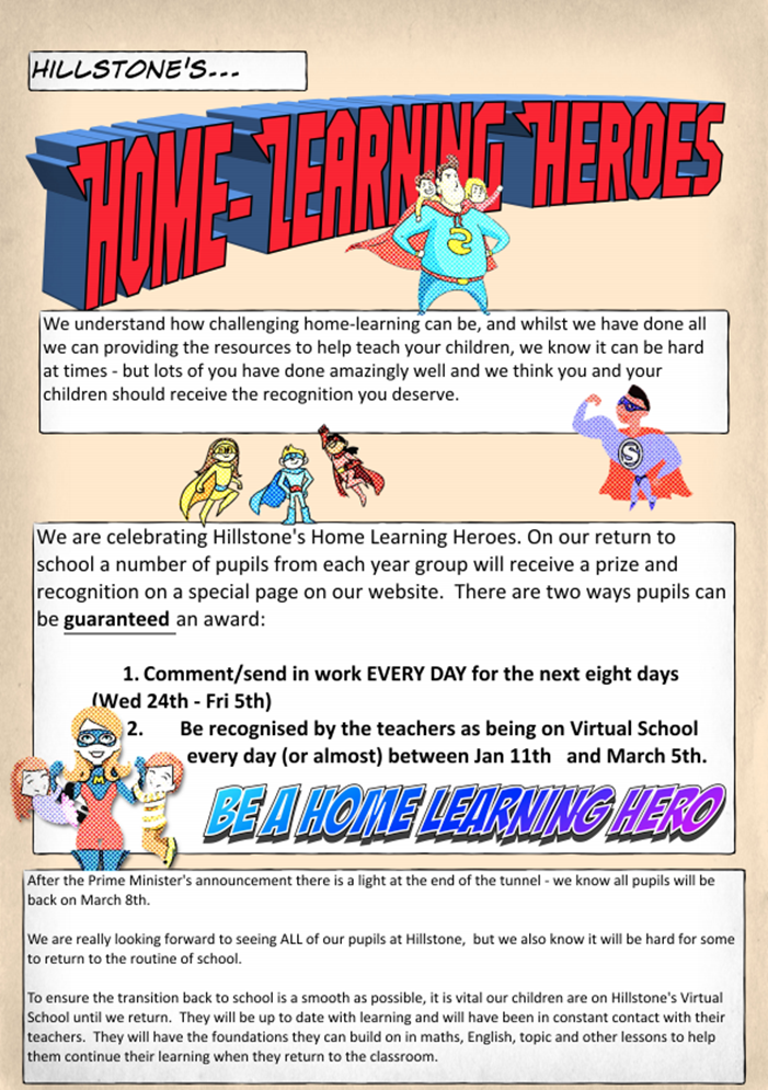 We would like you to log in into virtual school every day to access the learning. It is crucial that we maintain a routine that is as close as possible to a normal school day. New learning will be available each weekday and we ask that you leave us a comment (questions or messages) you have for your teacher. These will be answered daily so don’t hesitate to comment should you need any support or just want to check-in. Any work that you do, remember to tweet it @hillstoneps.