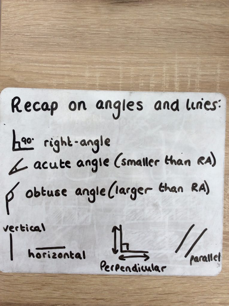 Today, we are going to be looking at how we can describe 2D shapes based on the angles and lines that they have. You will need to remember all the teaching on angles and lines for the next two lessons. If you can’t quite remember, not to worry, watch the recap video to start with before starting the lesson today. I have also included a recap photo for you to look at while you complete the tasks. Have your right angle tester ready as this will help you to see the different angles.