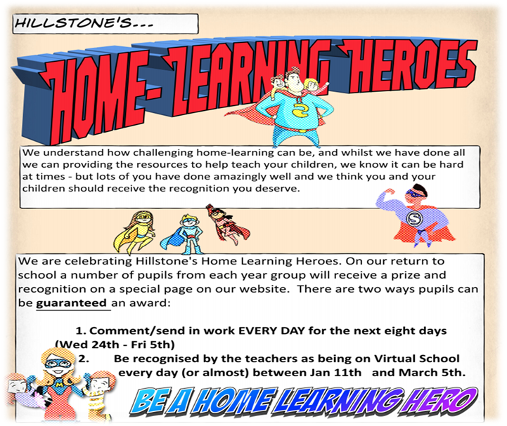 Remember the Home Learning Hero Challenge! Below is all the information! Sign in and send in work each day until Friday 5th March to achieve the award!