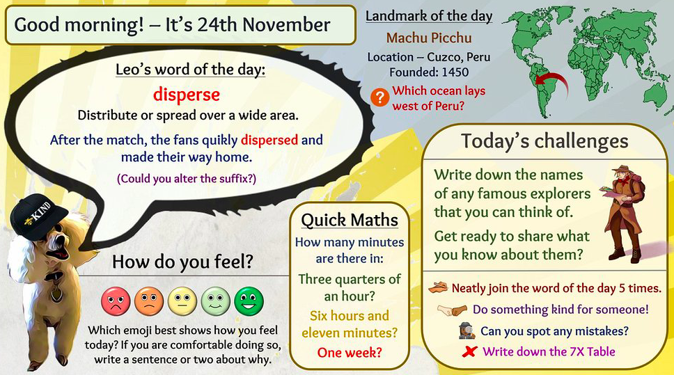 Let’s the start the day off with some early morning work! So, put your thinking hats on Year 4. Below is a picture of several things combined together – a couple of Maths, Geography, English questions, etc. These questions might be topics we may have not covered in lessons yet but that’s okay! Just give it a good go – you might learn something new! Again, if you need any support, please comment below. Make sure you have left a comment to let us know you’re here too!