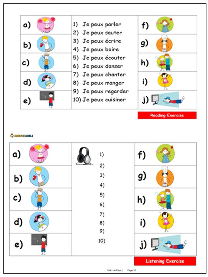 For the first part of our French Je Peux (Reading Exercise) recap match each numbered statement to the letter that shows its picture. Eg 1) Je Peux Parler is (C). Can you do the rest.