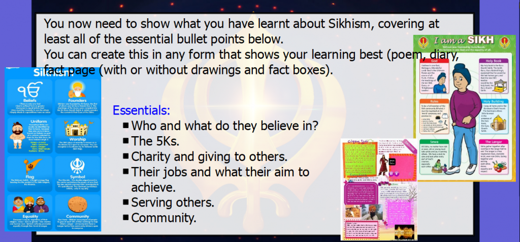 Today you are going to showcase all of your research on Sikhism from the last two weeks in a poster or fact file.